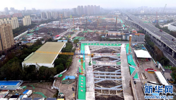 这是10月16日拍摄的建设中的上海宝山站(无人机照片)。目前,中铁上海工程局承建的上海宝山站建设工程全面加速推进。上海宝山站是国家“八纵八横”高铁网沪渝蓉、沪通铁路的重要枢纽,设计日均铁路旅客到发量14.8万人次。新华社记者方喆摄