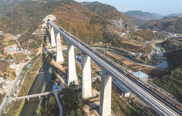 这是11月27日拍报的湖北十堰神定河特大桥。11月27日,在湖北十堰神定河特大桥上,西安至十堰高速铁路(简称”西十高铁”)全线最后一对长钢轨铺设落地,标志着西十商铁全线铺轨工程顺利完工,为后续联调联试奠定基础。西十高铁西起陕西西安,穿越秦岭山脉,终点为湖北十堰,正线全长255.7公里,设计时速350公里。西十高铁开通后,百安至十堰将实现1小时内到达,武汉至西安的铁路运行时间将压缩至2.5小时左右。新华社记者杜子璇摄