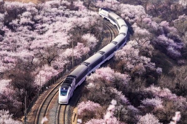 3月24日,一列客运列车穿行在北京市居庸关长城脚下的花海中。春日里,各地繁花盛开,春光如画。新华社发(刘满仓摄)
