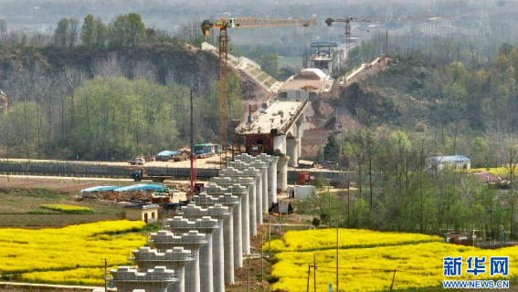 春日,中铁十一局合武高铁安徽段站前三标各施工现场一派繁忙,施工人员利用春季有利天气推进建设(3月29日摄)。新华社记者周牧摄
