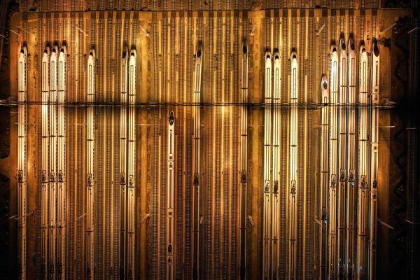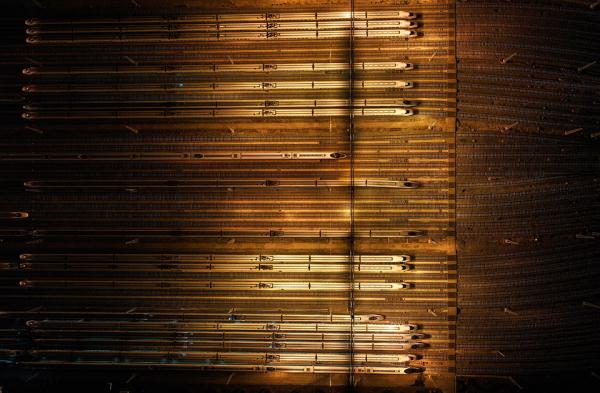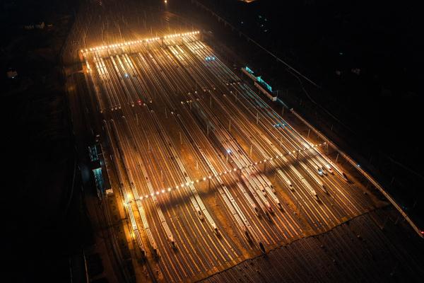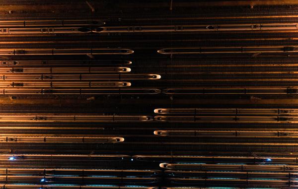 图为南宁屯里动车所,一辆辆完成检修的动车组在存车线上集结完毕,“万箭齐发”,场面壮观。