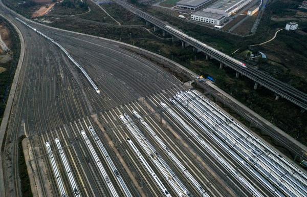 全国铁路运输陆续恢复运营。在有着“陆地航母”之称的南宁屯里动车所,一辆辆完成检修的动车组在存车线上集结完毕,“万箭齐发”,场面壮观。