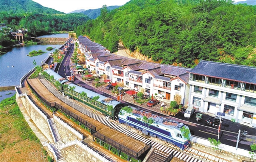 这里是中国国家铁路集团有限公司定点帮扶河南省栾川县的重点旅游景观项目——新南村铁路小镇。河岸边,游客三两成群,或垂钓,或在列车餐吧里喝咖啡。小孩子车上车下嬉戏玩耍,嬉笑声与鸟鸣声、流水声交织在一起。