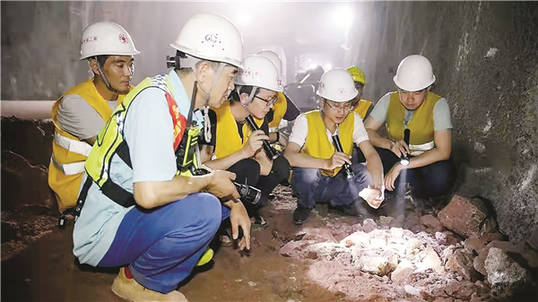 师傅潘福平和徒弟白小可在友谊隧道里留下了奋斗的身影。多少个日日夜夜,他们暗自较量又彼此支持,长长的隧道里流淌着浓浓的师徒情谊。上图为潘福平(左)在友谊隧道中查看渗水情况。下图为白小可(右二)在和技术人员探讨解决盐岩问题。陈 畅 摄