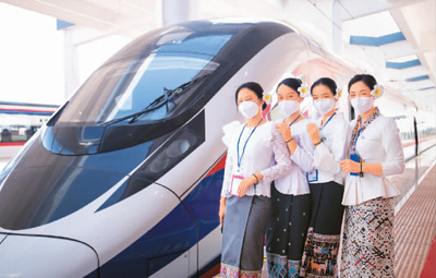 老挝工作人员在中老铁路万象车站“澜沧号”动车组前留影。凯 乔摄(新华社发)