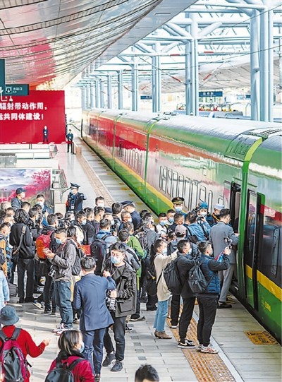 12月3日,乘客在中国昆明站准备搭乘中老铁路首发列车。新华社记者 胡 超摄