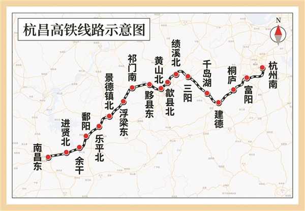 杭昌高铁起自杭州南站,途经浙江省杭州市,安徽省宣城市、黄山市,江西省景德镇市、上饶市、南昌市,接入南昌东站,线路全长560公里,其中杭昌高铁杭黄段已于2018年12月25日开通运营。本次建成通车的杭昌高铁黄昌段线路全长288公里,设计时速350公里,全线共设黄山北、黟县东、祁门南、浮梁东、景德镇北、乐平北、鄱阳、余干、进贤北、南昌东10座车站,其中黄山北、景德镇北为改扩建车站。