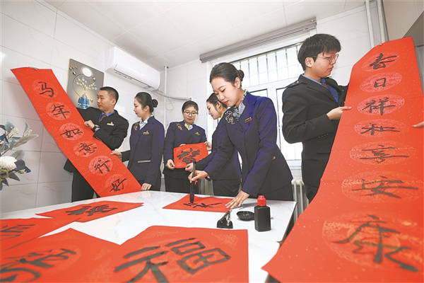 图④为齐齐哈尔客运段青年职工们在职工之家写春联和“福”字。 徐 率 摄