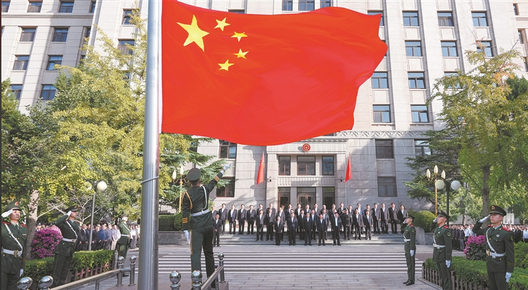 9月30日,中国国家铁路集团有限公司机关举行升国旗仪式,庆祝中华人民共和国成立76周年。国铁集团党组领导同志和机关干部职工参加升旗仪式。刘坤弟 摄