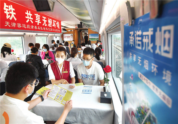 5月31日,在天津西开往兰州西的G1713次列车上,天津客运段乘务员为旅客讲解高铁禁烟规定。当天是世界无烟日,该段在管内列车上开展了“创建无烟高铁 共享无烟环境”主题活动。乘务员在车厢里向旅客宣传高铁禁烟法律法规和吸烟对身体健康造成的危害等内容,并发放宣传册和宣传卡片,倡导健康出行、绿色环保的生活方式。杨宝森 摄