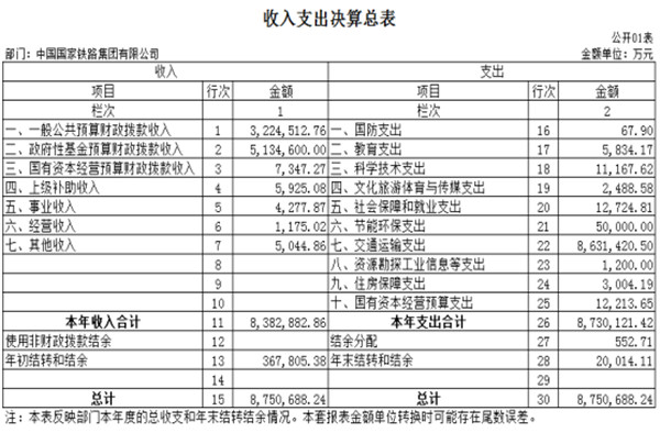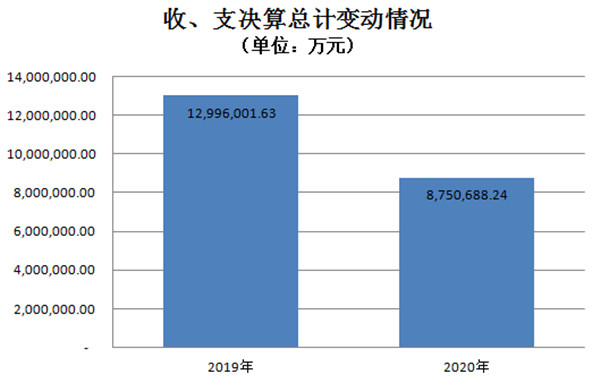 2020年度收、支总计8,750,688.24万元。与2019年相比,收、支总计各减少4,245,313.39万元,减少32.7%。主要原因:一是铁路公安预决算纳入公安部预决算管理;二是发改委基建项目支出减少。