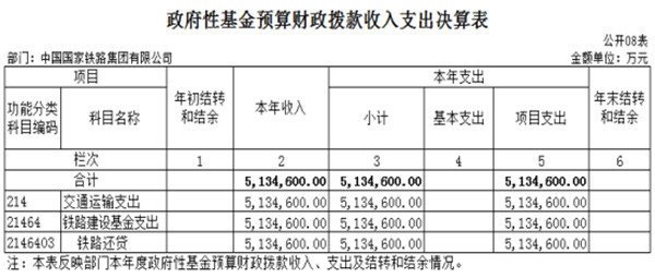 2020年度政府性基金预算本年收入5,134,600万元,本年支出5,134,600万元,主要用于支持铁路建设。