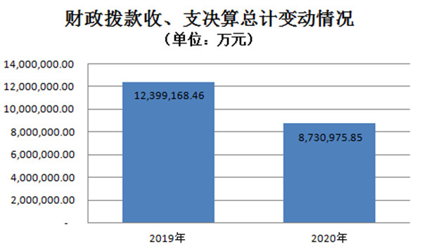 2020年度财政拨款收、支总计8,730,975.85万元。与2019年相比,财政拨款收、支总计各减少3,668,192.61万元,减少29.6%。主要原因:一是铁路公安预决算纳入公安部预决算管理;二是发改委基建项目支出减少。
