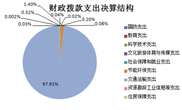 2020年度一般公共预算财政拨款支出3,567,823.48万元,主要用于以下方面:国防支出(类)67.9万元;教育支出(类)1,545.49万元,占0.04%;科学技术支出(类)11,167.62万元,占0.32%;文化旅游体育与传媒支出(类)658万元,占0.02%;社会保障和就业支出(类)7,239.38万元,占0.2%;节能环保支出(类)50,000万元,占1.4%;交通运输支出(类)3,493,119.44万元,占97.91%;资源勘探工业信息等支出(类)1,200万元,占0.03%;住房保障支出(类)2,825.65万元,占0.08%。