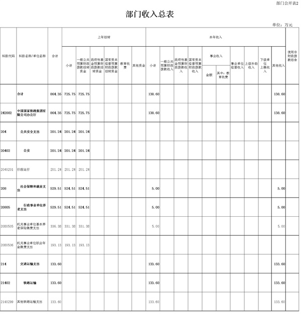 按照综合预算的原则,2022年中国国家铁路集团有限公司办公厅部门收支总预算864.35万元。收入包括:其他收入138.6万元,上年结转725.75万元。支出包括:公共安全支出201.24万元,社会保障和就业支出529.51万元,交通运输支出133.6万元。