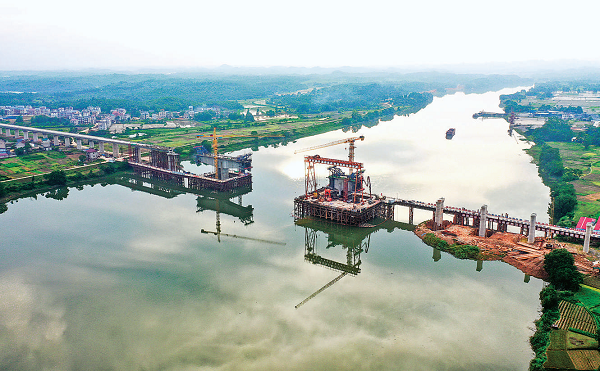 图为近日,建设中的凤凰昌江特大桥在夕阳映衬下犹如一幅美丽画卷。 鲍赣生 摄