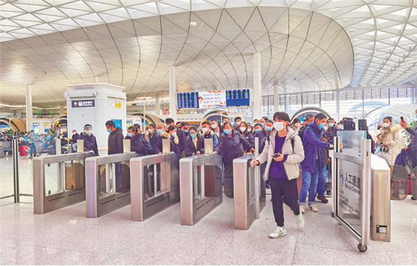 1月7日,2023年铁路春运启动。中国铁路上海局集团有限公司根据12306客票预售和候补购票数据,科学分析国家优化调整疫情防控措施后的旅客出行规律,动态灵活安排旅客列车开行,梯次投放运力,实现运能和需求精准匹配。图为当日,杭州西站,旅客有序检票上车。吴少妮 摄