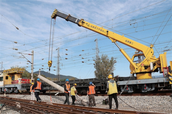 近日,大同西供电段利用大秦线集中修“天窗”,将站场改造时淘汰的一批水泥支柱拆除、清理。这些水泥支柱已被更加坚固、功能更强大的铁塔取代。图为该段茶坞供电车间职工在利用接触网作业车吊装拆下水泥支柱。刘 越 摄