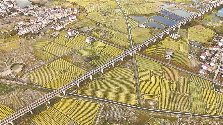 连日来,沪昆高铁江西段沿线的油菜花竞相绽放,风景美不胜收。为更好服务春游运输,中国铁路南昌局集团有限公司优化运力配置,提升服务质量,全力满足旅客出行需求。图为近日,一列复兴号智能动车组穿越油菜花海。车驰 摄
