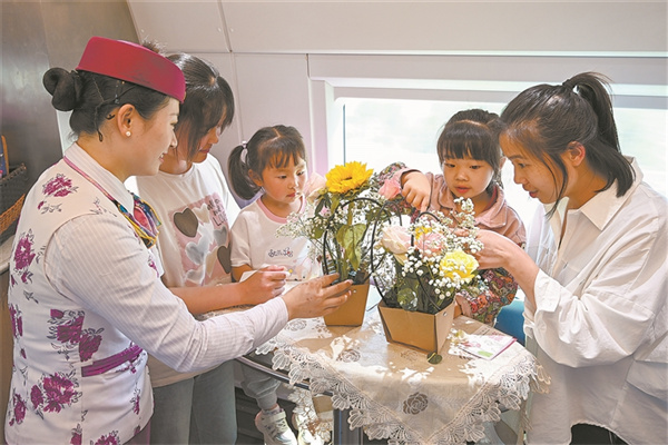5月10日,在重庆北开往上海虹桥G1534次列车上,重庆客运段动车二队“妈妈联盟”组织开展“以爱之名,以花为礼”母亲节主题活动,邀请旅客在餐车上参与“插花献礼”“感恩传递”“情寄贺卡”活动,为母亲送上节日祝福。图为“插花献礼”活动环节。包 亮