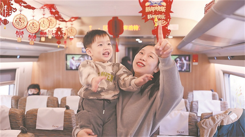 2月1日,我登上G3752次列车。车厢内节日气氛浓厚,特色景点解说、打卡攻略以及旅行小贴士等服务融入旅程之中。《坐着高铁看中国》《人说山西好风光》《美好出行》,一个个具有浓郁特色的文艺节目,将车厢的喜悦气氛推向高潮。一名小朋友在妈妈怀中新奇地张望,吸引了我的注意。可爱的笑容、热烈的鼓掌,我赶紧按下快门留下这一美妙的瞬间。