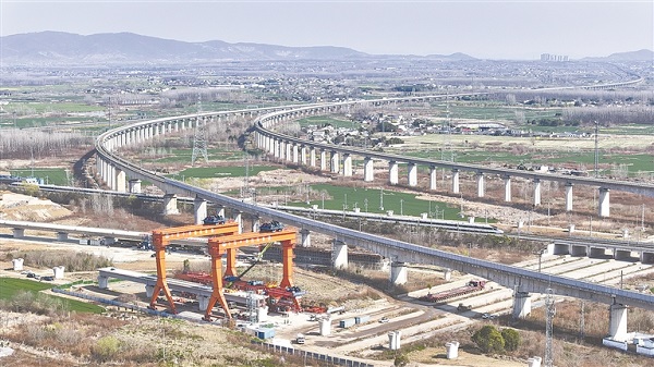 明媚春日,新建沪宁合高铁合肥枢纽建设现场一派繁忙景象,施工人员抢抓有利天气,高标准高质量推进项目建设。沪宁合高铁作为我国“八纵八横”高铁网沿江通道的重要组成部分,建成运营后,将成为江北沿江城市与南京都市圈、上海都市圈之间的一条快速直达通道。图为3月18日,沪宁合高铁合肥枢纽建设现场。新华社发