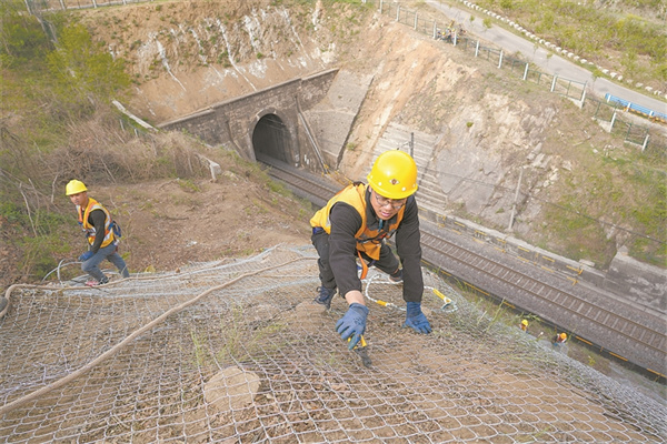 连日来,为确保汛期行车安全,南阳工务段组织作业人员对管内焦柳铁路重点区段的山体危石、风化岩层进行集中加固,为铁路运输安全畅通构筑坚实基础。图为4月9日,该段南阳桥梁车间作业人员在铁路沿线山体上铺设防护网。牛朕 摄