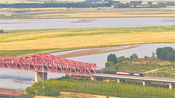 入汛以来,中国铁路郑州局集团有限公司持续加大路地联动合作力度,动态开展防洪隐患排查整治和汛期风险联合防控,充分保障汛期客货运输安全畅通。图为近日,一列货物列车行驶在郑焦城际铁路黄河大桥上。王玮 摄