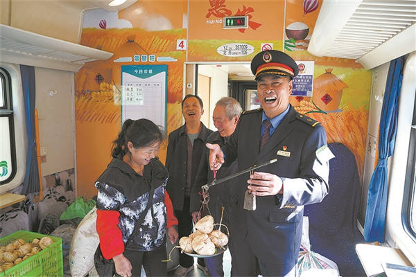 10月15日,在广元开往宝鸡的6064次公益性“慢火车”上,铁路工作人员协助沿线村民在“惠农车厢”里售卖农副产品。贾智炜 摄