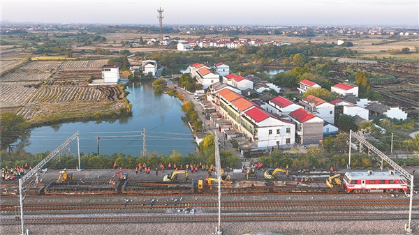 为提升京九铁路设备的安全性和稳定性,南昌工务段在三江镇站开展站内集中修,采用“预组轨排+整体运输”的施工模式,提高集中修施工效率与质量。图为近日,三江镇站集中修施工场景。胡国林 摄