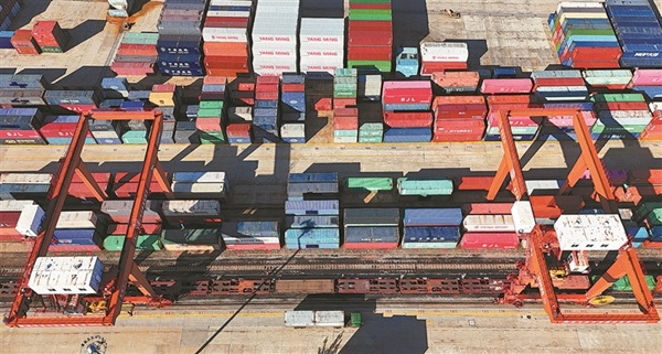 今年以来,江苏省连云港中欧班列运输效率持续提升,货物发送量稳步增长,为高质量共建“一带一路”注入强劲动能。图为11月10日,中哈(连云港)物流合作基地,班列正在进行集装箱装车作业。耿玉和 摄