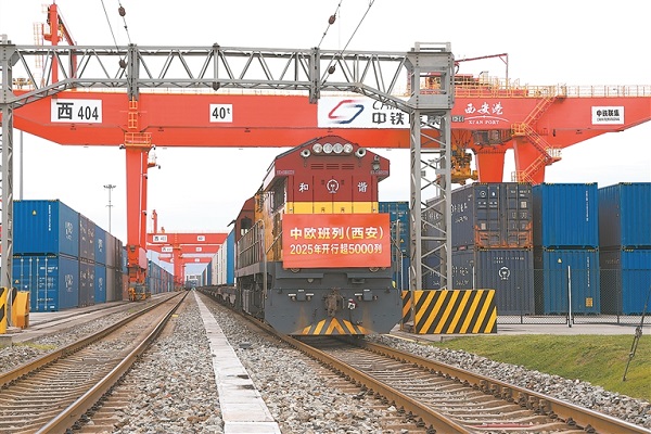 今年前10个月,中欧班列(西安)累计开行5063列,首次实现年度前10个月开行量突破5000列大关,创历年同期最高纪录。图为11月17日,一趟满载光伏组件、跨境电商货物的中欧班列从西安国际港站发车。孙季翔 摄