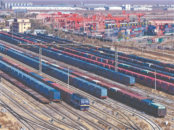 连日来,中国铁路呼和浩特局集团有限公司统筹货源和运力配置,优化运输组织,科学规划装卸场地,不断提升运输质效,推动增运增收。图为11月21日,货物列车在二连浩特铁路口岸准轨场整装待发。张海峰 摄