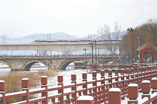 12月14日,雪后的北京卢沟桥畔,朱红栏杆被白雪轻覆,与古朴的石拱桥相映成趣。远处高架桥上,复兴号动车组列车如游龙飞驰而过。千年古桥的沧桑底蕴与现代高铁的速度激情在此碰撞,尽显北京城独有的历史韵味与发展活力。刘坤弟 摄