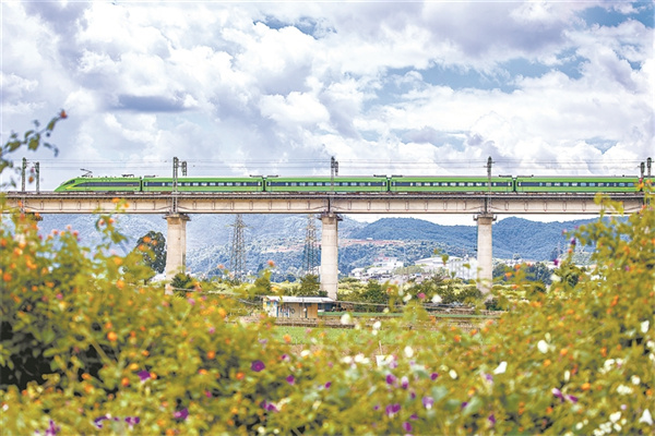 图为近日,满载旅客的复兴号动车组列车行驶在中老铁路大梨铧营双线特大桥上。徐章位 摄