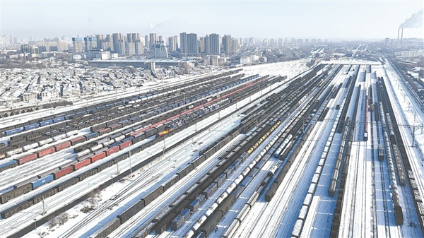三九时节,哈尔滨南站积极开展电煤、生产物资保供专项行动,日均解编货物列车超1.3万辆,全力保障民生物资运输安全高效。图为1月15日,装满物资的货车在哈尔滨南站编组场内整装待发。原勇 摄