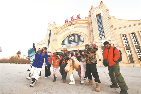 当前,冰雪旅游持续升温。铁路部门精准对接旅客出行需求,加开旅游列车,试点推出“雪具便利行”服务,打造暖心服务驿站,畅通接驳通道,为冰雪经济注入源源不断的动能。图为近日,旅客在哈尔滨站合影留念。本报记者 刘一嬴 摄