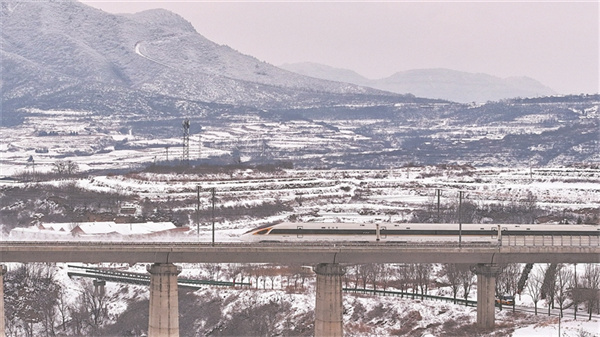 连日来,山西省中南部山区迎来降雪寒潮天气,中国铁路郑州局集团有限公司持续加大管内郑太高铁行车设备检查力度,增开热滑车进行供电接触网打冰作业,全力保障山区高铁行车安全畅通。图为1月20日,一列动车组列车行驶在郑太高铁晋城太行山区段。王 玮 摄