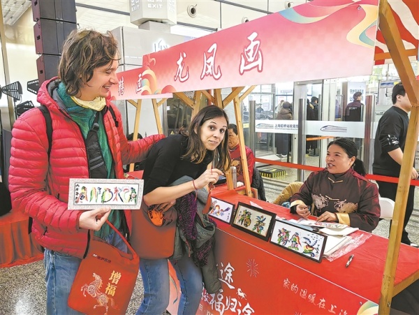2月2日,春运首日,作为国际化大都市的窗口,上海虹桥站候车大厅人头攒动、热闹非凡,“城市文明会客厅”、非遗文化市集等特色活动有序开展,让旅客感受到铁路服务的温度。图为当日,外籍旅客在非遗文化市集花鸟字创作区,观看师傅用花鸟图案绘制名字。东方匀 摄
