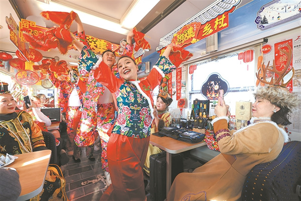 2月4日,在哈尔滨开往加格达奇的K7103次列车上,一场别开生面的“列车大集”火热开市。车厢内张灯结彩,年味浓郁,为旅客打造温暖而喜庆的春运出行体验。图为当日,列车工作人员在车厢内表演民俗舞蹈。徐 率 摄