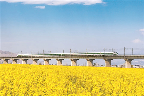 连日来,全国多地气温持续回升,油菜花连片盛放。铁路部门加大运力投放,提高服务品质,助力更多旅客乘着火车奔赴春日之约。图为近日,一列复兴号动车组列车行驶在新成昆铁路上。胡浩燃 摄