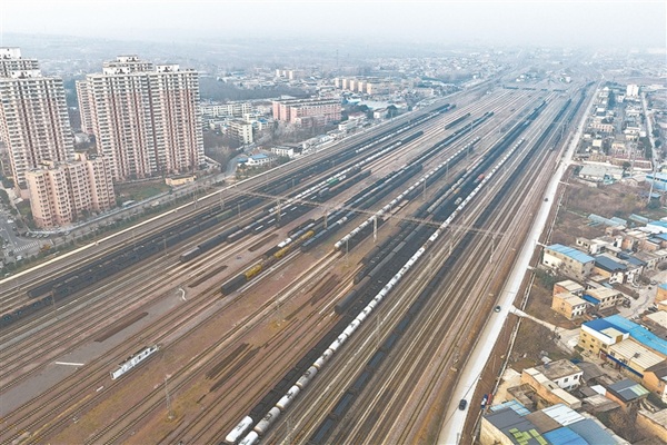 在洛阳北站驼峰编组场,钢轨纵横交错,宛如一张巨大的“钢铁棋盘”。一列列满载煤炭、粮食、建材等民生物资的货运列车,在这里有序解体、重新编组,再奔赴全国各地。图为近日,一列列货物列车在洛阳北站驼峰编组场集结。武闯丽 摄
