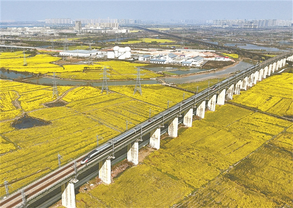 近期,江西、福建等地天气晴好。为进一步方便旅客踏青出行,铁路部门精准加开旅客列车,优化服务举措,助力地方赏花经济发展。图为3月12日,江西南昌的虎山村一带,油菜花竞相绽放,一列复兴号动车组列车行驶在昌福高铁上,绘就出花海列车美丽画卷。周心融 摄